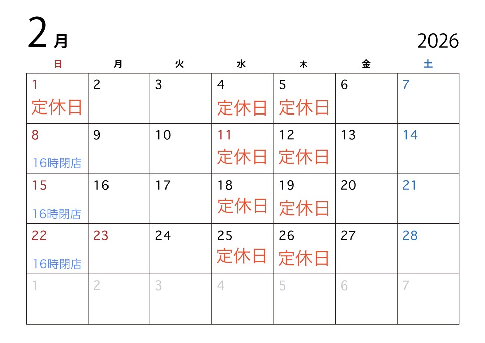 2月8日(日)・2月15日(日)・2月22日(日)…16時閉店