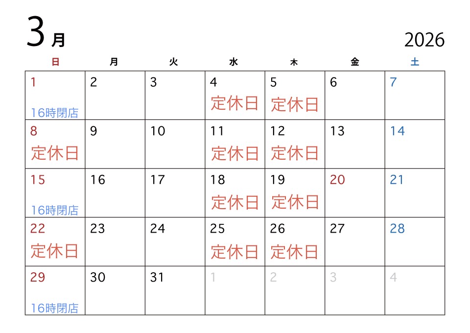 3月1日(日)・3月15日(日)・3月29日(日)…16時閉店